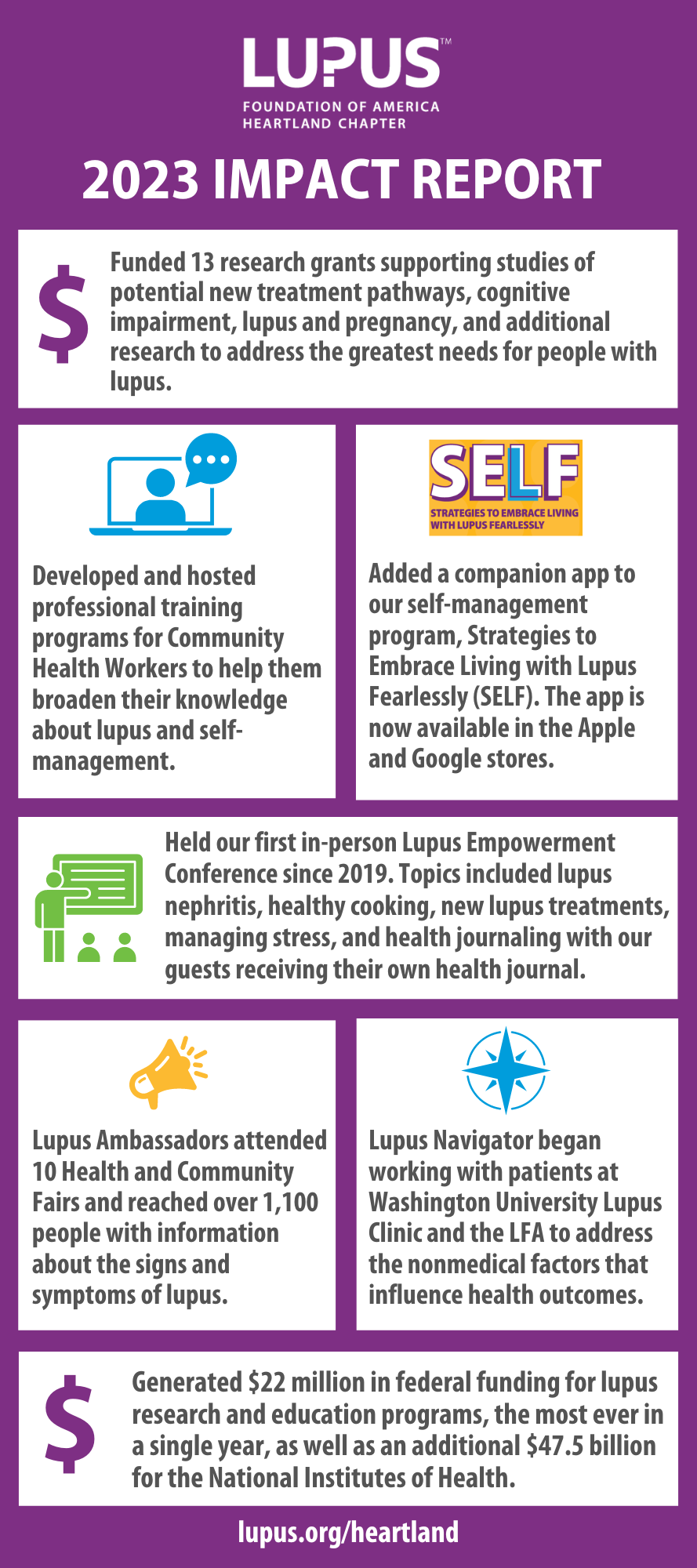 Over the last several years we have seen such incredible progress in medications developed specifically for lupus and lupus nephritis, with new treatments coming to market. The Lupus Foundation of America has contributed to nearly every significant research breakthrough in lupus, and we remain steadfast in our commitment to continue building on our milestones, which in 2023 included: