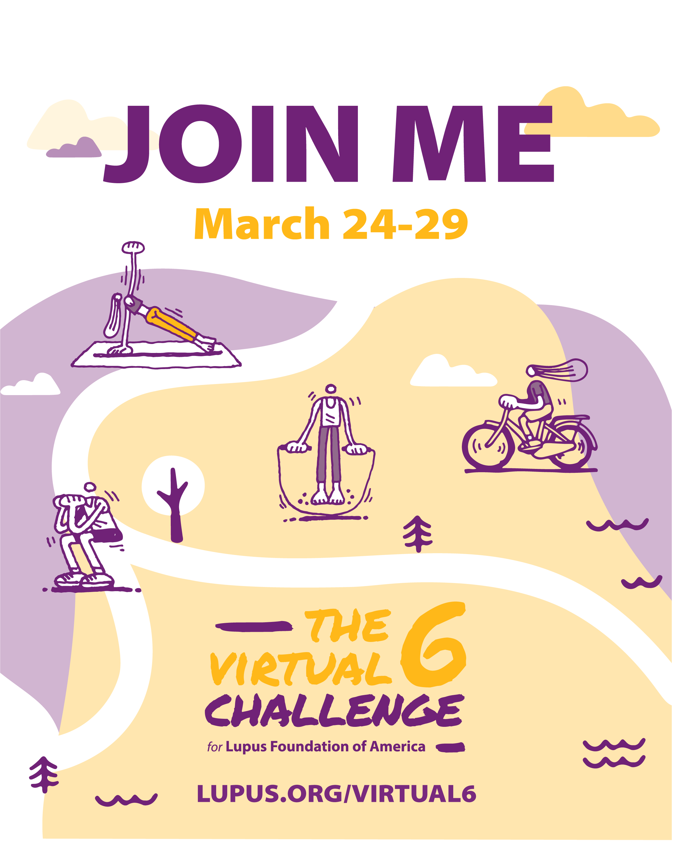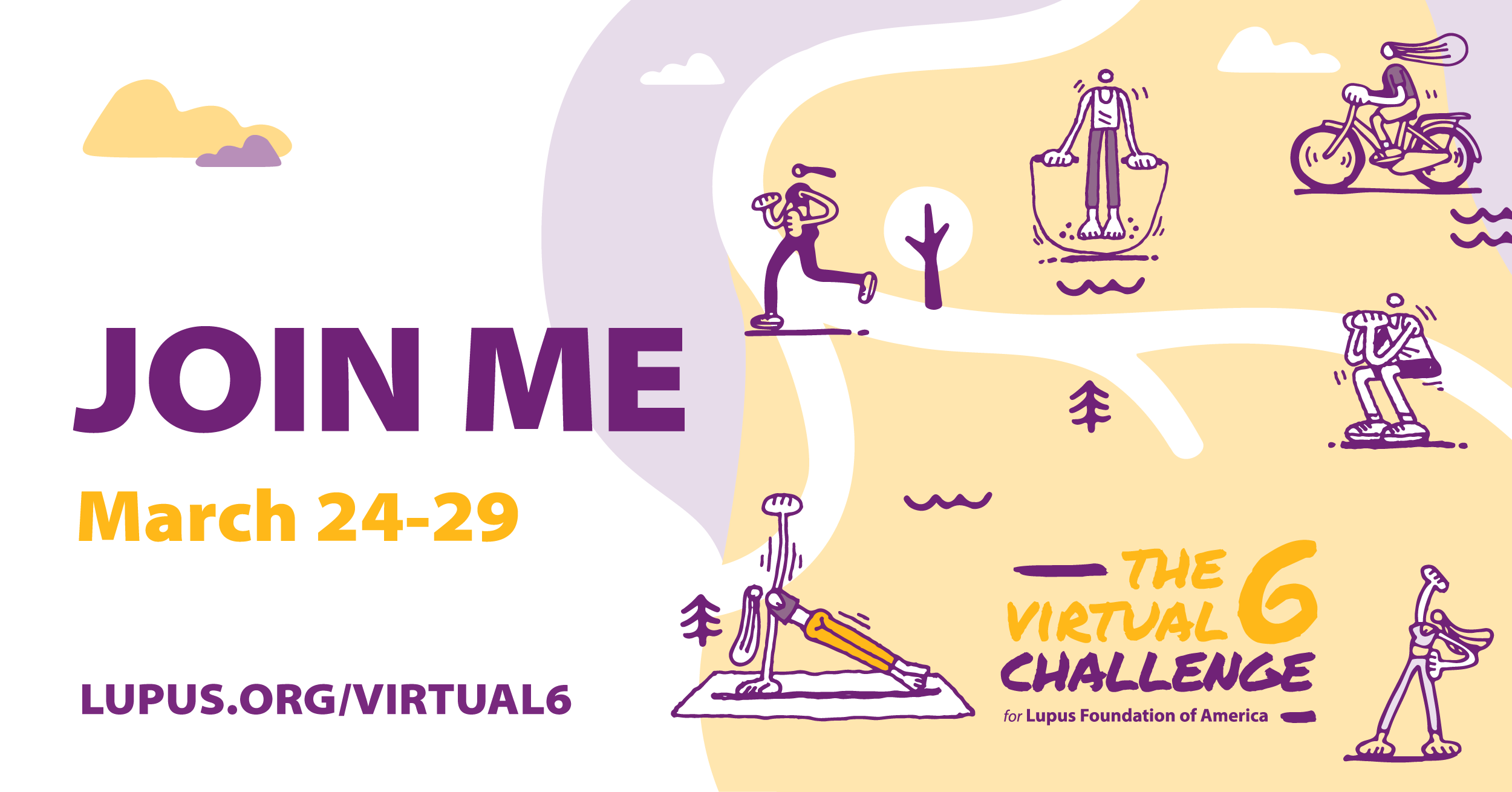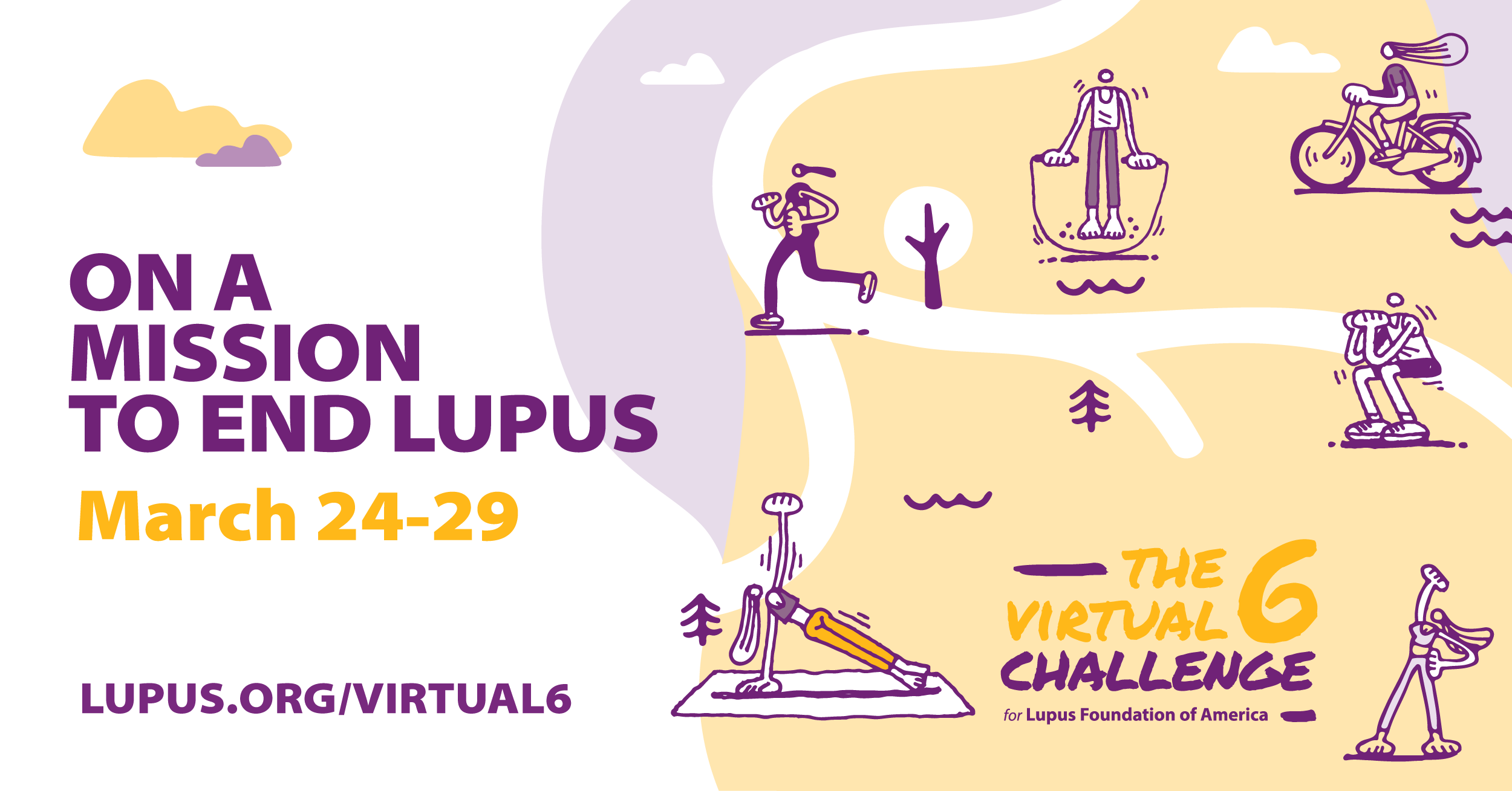 - I am proud to announce that this/ next week/ month, I will be running/ biking/ hiking/ swimming 6 miles/ over 6 days to help end lupus with the #Virtual6Challenge for @lupusorg. (Add your connection to lupus/why you are taking on the challenge). #Virtual6Challenge [Include link to Virtual 6 landing page or your personal fundraising page]